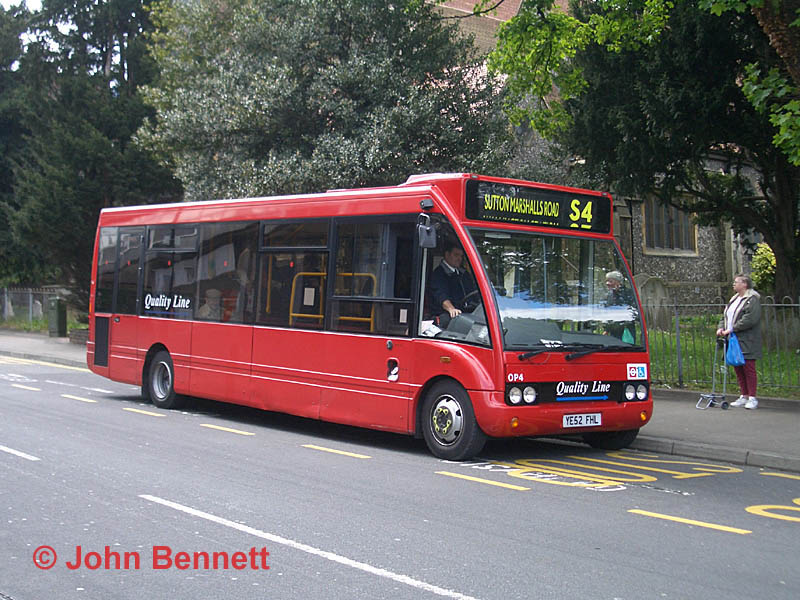 OP4 (YE52 FHL) was one of the first Solos in the Quality Line fleet and was seen outside St. Nicholas Church in St. Nicholas Way, Sutton, on Wednesday 11 May 2005. (I am afraid this one has been on my "to-do" list for a very long time.) Hopefully the rather makeshift blind display was a one-off aberration! The latest vehicles on the route are a pair of Enviro200Darts, running alongside the Solos, but I do not have a picture at present.